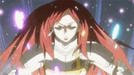 Fire and Magma Armor: This armor is dark red predominantly, but also sports orange and black parts, with the first ones being shaped like flames and the second being reminiscent of dragon’s limbs. It’s basically made up of three different parts: the breastplate, the gauntlets and the greaves. The breastplate lacks pauldrons, revealing Anna’s shoulders, and extends down to cover Anna’s groin, revealing her legs. the black parts on it are mostly decorative, with one covering her groin. The gauntlets sport prominent orange decorations, along with small claw-like protrusions on the hands. The greaves are shaped like dragon’s claws, possess orange-coloured knee guards, and black parts which extend up from the knees to the upper part of the thighs. The breastplate possesses a pair of dragon-like wings attached to it, and, while donning this outfit, her hair is tied into a pair of high, long pigtails by clips resembling dragon’s horns. This armor comes equipped with a large bastard sword which is predominantly dark red in color, but sports orange decorations on its handguard. Anna uses this armor when she uses her daughter Azami's zanpakuto special ability.