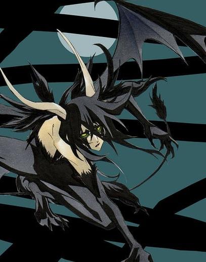 In the past, she was a black Hollow[1] who evolved into a white Hollow after devouring the majority of her clan. As a Vasto Lorde, she was humanoid and bony, with a white exoskeleton and mask, green eyes, two large horns, and a pair of black wings on her back.