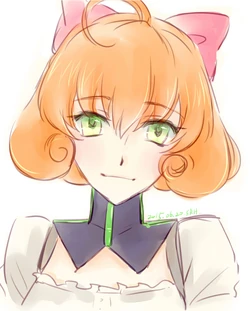 Arisu is a beautiful young lady with an enigmatic and ephemeral air about her, described as by those around her, especially those of the opposite sex. This is especially shown in the way she presents herself, going from her oddly colour-coordinated clothing to her long, silver hair; she is a fairly busty young woman who seems to be in her early-to-late twenties, though truthfully, her age is incredibly difficult to properly determine, even by those who have known her from the very beginning. Due to the almost flawless grace that she displays while in combat, she is described as a maiden with a fair skin tone, being peachy-white in colouration Arisu's hair isn't something that one would really refer to as "conventional" – it's a far cry from the ankle-length rapunzel-esque hair of a supermodel nor hair that's just cut in a bob and left like that as per a tomboyish young lady, but rather, Arisu's vibrant orange hair is cut short (around chin-length) and is rather curly, with two big fluffy lumps of hair on both sides at the back and a serial of random strands hanging over her forehead which are just left like they're a bother, no point in cutting them; but to be fair, she isn't the kind of person to really put any care into her personal appearance unless she's going to put on a show. Arisu's orange bangs frame her face on both sides and are parted in the middle to slightly expose her forehead, as two long clumps tied into braids trail downwards to frame her youthful face. There is a trio of bundles of blazing hair exposed in the very middle of her forehead, with the longest extending down to reach her nose – freckles are dotted all around her face. Complimenting this is her shining emerald eyes that constantly glitter and the pink bow on the back of her head.