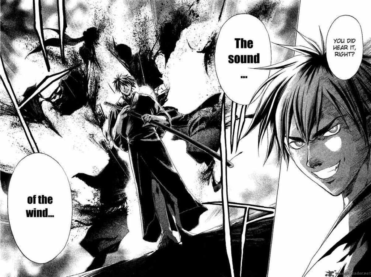 Form VI is an offensive-minded and dominating Zanjutsu form combining lacerating wind currents and extreme speed to "cut through it all".[1] A practitioner of the Niten is always looking to be on the offensive and when successfully defending against an attack, they will use the momentum of a foes attack against them in their counter-strike, thus returning to the offence.[2] Kenji once admitted that no-one had mastered the Niten except Kentaro, who was by far its greatest practitioner. Following the Collapse Kentaro is the sole master of the form left alive, though Kensei Muguruma has been trained in its use, firstly by Kenji, and then by Kentaro, for he used it with much success against Amagai.[3]