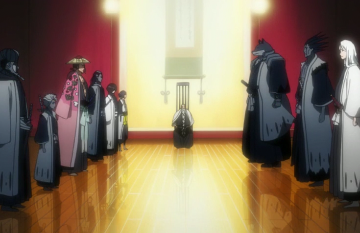 The Captains congregate together in the main hall of the First Division Headquarters to discuss important issues involving their specific divisions and matters that affect Soul Society. This council is highly formal with the captain-commander leading its proceedings. All captains are considered equal (with the exception of the captain-commander) and determine the course of their individual division unless dictated otherwise by the captain-commander. Votes are carried out via a unanimous consensus.