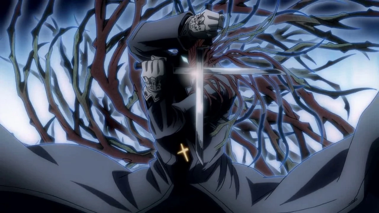 - Bankai: Kaminoikari (神の怒り, Wrath of Divinity): The name of Hachiro's Bankai. To activate it, he slides his blades together in the shape of an upside-down cross. Both of the weapons glow for a brief period before he is enveloped in a pillar of his spiritual energy. When it clears, Hachiro is dressed in new attire; a black cassock and matching pants. His two blades have merged and transformed into a claymore with a gold hilt and clover-like shapes at the tips of said hilt.