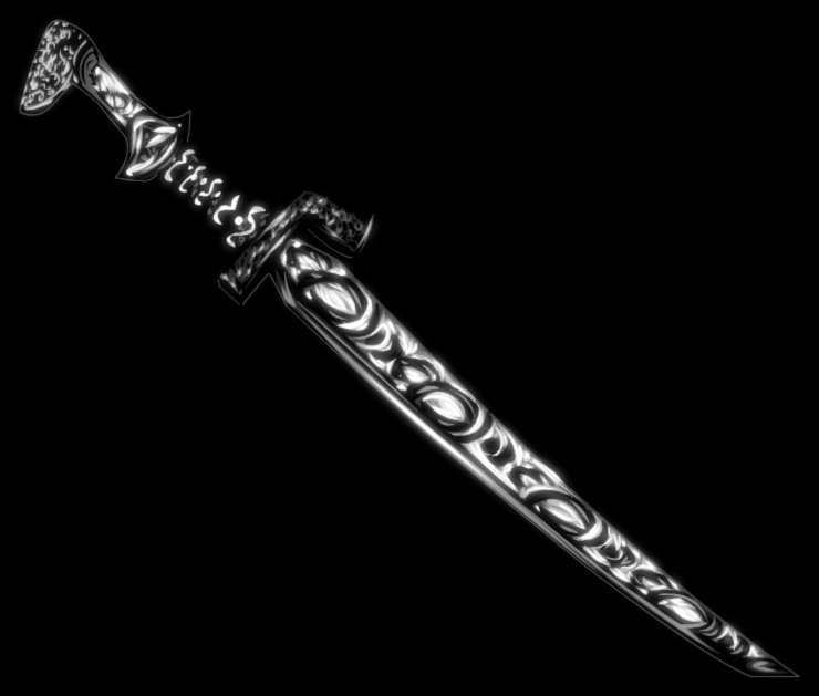 When released, Monban Seīki takes the form of a wide longsword with black runes engraved upon its single-edged blade. It notably possess a double-hilted design and a broad black slate guard that bends outwards at the top of the blade. The handle as a whole is considerably engraved. The pommel of the sword points downward and seems to be comprised of black marble.