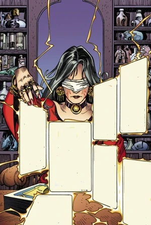 Madame Amarantha has been described as beautiful by the majority of men whom have visited her parlour for arcane services. The gruesome scars left behind by her pact makes her opt to wear a blindfold of white cloth, both to hone her senses and to hide the view of her mutiliated eye-sockets. The Madame always wears a long crimson dress with a rather low neckline that flows after her as she walks, along with having a good deal of jewelry, including several golden rings, a choker made of black cloth and which holds a round tablet of pure gold inscribed with various words that none of her customers have managed to comprehend, her rings also have similiar phrases inscribed inside. The Madame is also known to carry around several odd poultices and potions, whom she strictly discourages guests from touching carelessly.