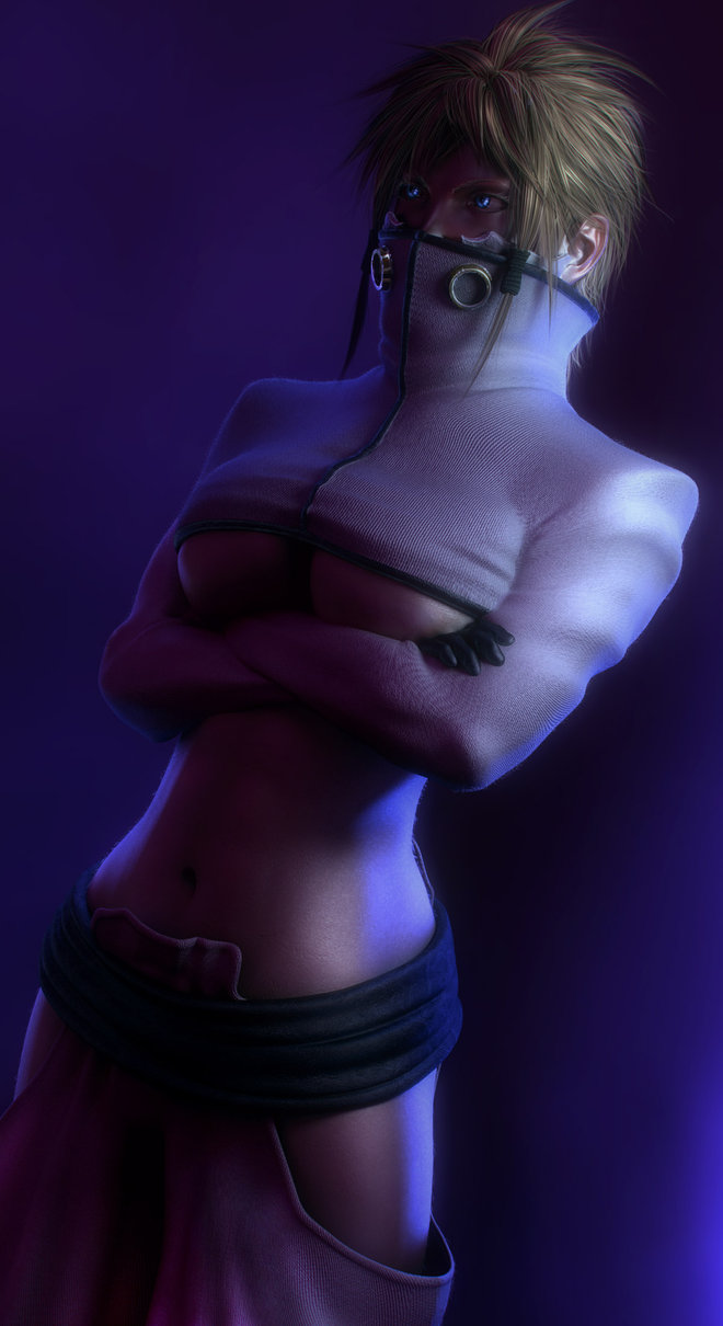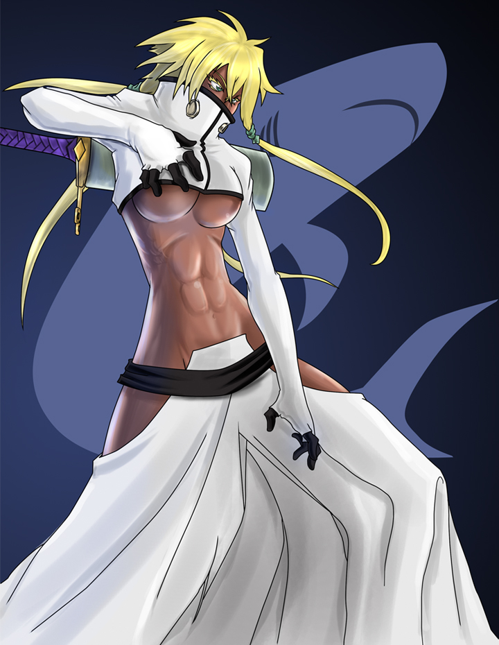 Harribel has dark skin, green eyes, blonde eyelashes, and messy short blonde hair which has three braided locks. She wears a variation of the Arrancar jacket that covers the lower part of her face downward, while baring a good portion of the lower half of her large breasts. The jacket, unlike that of other Arrancar, has a zipper running along its entire length that is opened from the bottom upwards (in the anime, this outfit is extended to fully cover her breasts, a black stripe showing where the original cut of the jacket was). The jacket's sleeves completely envelop her arms, terminating in black glove-like extensions at her extremities, which slightly gives her fingers the appearance of a cat's paws. Harribel carries her Zanpakutō horizontally across her back (similar to Soifon). The sword itself is notably broad and short compared to others, and has a western-style guard.
